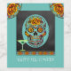 Halloween-Party-Weinflaschen mit einem Zuckerschädel und dekorativen Blume in Gelb, Türkis und Orange mit dekorativen Elementen.