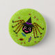 Es ist Halloween und diese Spinne ist für einen Trick- oder Behandlungs-Spaß bereit! Sie trägt ihr Hexenkostüm mit gestreiften orangen und schwarzen Strümpfen, Hexenschuhen mit Schnallen und einem Hexenhut und lächelt, während sie ihr Netz mit Süßigkeiten füllt. Hintergrund ist grün mit Spinnennetz.