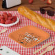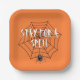 Große schwarze Spinne mit leuchtenden Augen im Spinnennetz auf orangefarbenem Hintergrund. Die Hintergrundfarbe kann geändert werden.