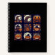 Diese lebhafte und farbenfrohe Illustration zeigt eine Sammlung von Halloween-Designs, die sich um Kürbisse drehen. Es gibt Kürbisse mit sprichwörtlichen Gesichtern, Kürbisse mit Hexenhüten und Kürbisse, umgeben von Fledermäusen und Sternen. Weitere Elemente sind Geister, Schädel und wirbelnde Muster. Die Stimmung des Bildes ist festlich, spukhaft und etwas unheimlich, perfekt für Halloween-Feiern.