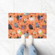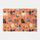 Halloween Spitz Hunde mit Schokolade, Schwarz, Creme, Bräune und Silbermäntel halten Trick-oder-Leckerei Kürbis, tragen Hexenhüte und Pullover mit verstreuten Fledermäusen, Pfoten und Hundeknochen.