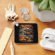 A glamorous witch brews a glowing potion while vampires, ghosts, and ghouls gather around a haunted house on Halloween night.