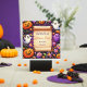 Das Design verfügt über einen Bildlauf in der Mitte über ein älteres Pergament, das einen Leerraum für Text bietet. Um die Schriftrolle herum befinden sich verschiedene Halloween-Symbole, darunter Lächeln von Jack-o’-Laternen, Geister mit verschiedenen Ausdrücken, Bonbons, Halloween-Lolli, schwarze Spinnen und Fledermäuse. Der Hintergrund ist sehr lila mit subtilen Sternmustern und schafft eine spielerische und sprichwörtliche Atmosphäre, die perfekt zu Halloween passt.