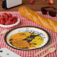 Niedliche Halloween-Teller mit sprichwörtlichem Grinsen und Jack o'lantern.