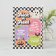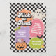 Spooky Vibes zwischen Geburtstagseinladung mit Gespenst, Süßigkeiten, Fledermäusen und Schachbrett Hintergrund.