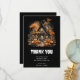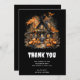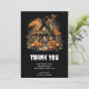 Vielen Dank Karte mit einer coolen und sprichwörtlichen Abbildung eines aus Holz Spuk Hauses. Umgeben von großen orangefarbenen Kürbissen und Bäumen mit orangefarbenen Blätter. Fenster mit orangefarbenen Lichtern sorgen für ein schönes Licht. Spaß Halloween Design.