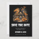 Save the Date Karte mit einer coolen und sprichwörtlichen Abbildung eines Spuk Holzhauses. Umgeben von großen orangefarbenen Kürbissen und Bäumen mit orangefarbenen Blätter. Fenster mit orangefarbenen Lichtern sorgen für ein schönes Licht. Spaß Halloween Design.