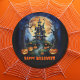 Halloween Rundpapier Teller mit einem Spuk Haus auf einem Hügel mit beängstigend leuchtenden Kürbissen im Vordergrund. Die ungezwungene Atmosphäre, die durch die dunkle Nacht mit Mond, beängstigenden Bäumen, Haus und den glühenden Kürbis geschaffen wurde, ist der ideale Set für ein Halloween-Party. Diese Halloween-Illustration ist in ai Art Aquarell und Bleistift gemacht.