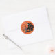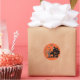 Vergnügliche Halloween-Aufkleber haben einen orangefarbenen wirbelfarbenen Hintergrund, ein Spuk Haus mit einer schwarzen Katze, die aus der Tür schaut, ein Geist im Glockenturm und ein anderes, das aus dem Dachgeschoss kommt. Am Himmel hängt ein seltsamer alter Baum mit einer Laterne, Grabsteine und Fledermäuse. Ideal zum Siegel einer Halloween-Karte oder Party Einladung, oder um als Gastgeschenke auszugeben.