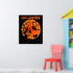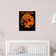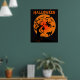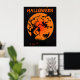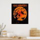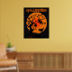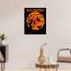 Halloween Spuk Place Poster. Cooles Poster in Schwarz und Orange mit einem Spuk Ort. Ein unheimlicher Baum mit einer Eule, eine Hexe auf einem Besen, Fledermäuse, eine schwarze Katze und Kürbislaternen bilden dieses Bild eines Spuk Ortes.