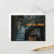 Die Postkarte zu Halloween bietet ein künstlerisches, digitales Bild einer Spuk Treppe mit Gespür, Kessel, Eule und Kandelabra. Anpassbare Textüberlagerung im Graustufenstil