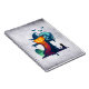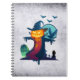 Ein Notizbuch mit einer coolen Zwischenablage. Set auf grauem Grunge Hintergrund. Eine große Spuk Kürbis, die böse aussieht mit einem Jack-oder-Laternen Kürbiskopf, der einen Hexenhut trägt. Er hat ein bedrohliches Grinsen mit zertäterten Roben und ist in einem Friedhof stehend, wo eine Krähe auf seinem Arm schreit. In der Ferne fliegen Fledermäuse ab, ein Vollmond im Hintergrund und eine einsame Eule mit leuchtenden Augen sitzen auf einem Grabstein.