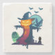 Ein Untersetzer mit einer coolen Halbblenddarstellung. Eine große Spuk Kürbis, die böse aussieht mit einem Jack-oder-Laternen Kürbiskopf, der einen Hexenhut trägt. Er hat ein bedrohliches Grinsen mit zertäterten Roben und ist in einem Friedhof stehend, wo eine Krähe auf seinem Arm schreit. In der Ferne fliegen Fledermäuse ab, ein Vollmond im Hintergrund und eine einsame Eule mit leuchtenden Augen sitzen auf einem Grabstein.