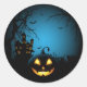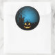 Rundform Aufkleber gezeigt in einem hüpfenden Halloween Kürbisszene-Druck. Passen Sie dieses Objekt an oder kaufen Sie es, wie es ist. Archivbild freepik.com