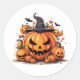 Der Rundaufkleber wird mit einem festlichen Halloween-Kürbiskunstdruck gezeigt. Große Größe angezeigt Anpassen Sie dieses Objekt oder kaufen Sie, wie es ist.