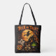 Diese lebendige Halloween-Illustration bringt alle klassischen gruseligen Symbole in einer auffälligen Szene zusammen. Ein leuchtender Vollmond setzt die Bühne, während eine Hexe über den Himmel fliegt, umgeben von flatternder Fledermäusen. Darunter erhebt sich ein Spukhaus mit leuchtenden Fenstern aus einer schattigen Landschaft mit kahlen Bäumen und schiefen Grabsteinen.