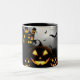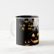 Tasse des Kaffees, die in einem Halloween-Spuk Kürbisprint gezeigt wird.