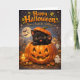 Illustration features an adorable black kitten popping out of a glowing jackal lantern waving a tiny paw under a full moon set in a magical autumn scene with friendly little ghosts flickering candles and bats fluttering by. It's the perfect way to wish friends and family a fantastic holiday with its warm storybook glow and vibrant colours. This card is a keepsake worthy treasure that captures all the charm and wonder of Halloween night