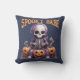 Halloween-Kissen aus jungen Skeletten im lila Mantel saß in einem spukhaften Kürbispflaster mit der Kapselspuze.
