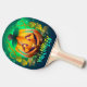 Ein Pingpongpaddel mit Halloween-Design, mit einem Cartoon-Kürbis mit einem lächelnden Gesicht und leuchtenden Augen, Set vor einem grünen und blauen Hintergrund mit wirbelnden Weinen und Wolken, das Wort "HALLOWEEN" ist in einem stilisierten Schriftart am Boden des Paddels geschrieben, der Paddelgriff ist aus hellem Holz mit vertikalen Kornmustern.
