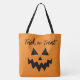 Die perfekte wiederverwendbare Halloween Trick oder Treat Tote Tasche mit einer Kürbislaterne Kürbisgesicht in schwarz auf orangefarbenem Hintergrund, oben mit den Worten "Trick or treat".