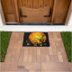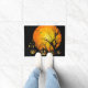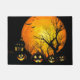 Die Türmatte, die mit einer schwarzen Hintergrundfarbe und ein Spuk Haus Halloweens gezeigt werden und die Kürbise drucken.