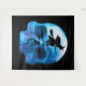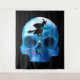 Eine Hexe fliegt an einem blauen Schädel vorbei