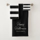 Dekorieren Sie Ihr Bad im Oktober mit diesem Personalisierten Badetuch-Set zu Halloween Black and White Script. Das große Badetuch ist mit einem individuell anpassbaren schwarzen Hintergrund gestaltet und der Text ist "Happy Halloween" in weißer Handschrift Schriftzeichen auf der unteren Mitte. Personalisiert mit Familienname in weißem Schriftart. Handtuch und Waschlappen sind in schwarz-weiß gestrichen. Klicken Sie auf Vorlagenoption personalisieren und geben Sie den Namen ein.