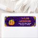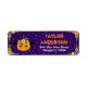 Adorable orangefarbene Kürbis mit einem schwarzen Einhornhorn und Fledermausflügeln. Der dunkle lila Hintergrund hat orangefarbene, gelbe, grüne und lila Halloween-Konfetti und blühende Blume und Blätter in den Ecken. Grafik nach PrettyGrafik