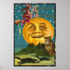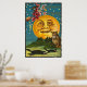 Halloween Vintage Karte mit Grüßen...Hexe auf Besen fliegen, lächelnder Mond, Eule, Bäume und 2 schwarze Katzen Poster.