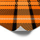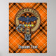 Halloween Wappen Abzeichen mit fliegender Fledermaus, umgeben von einem Gurt und Schnallen über dem Tartan Hintergrund. Eigener Text.
