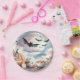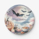 Ein skurriles Halloween-Szenario mit einem großen, glühenden Vollmond, umgeben von weichen Wolken. Neben kleineren Kürbissen befindet sich ein gemeißelter Kürbis mit einem fröhlichen Gesicht. Mehrere Fledermäuse flattern über den Himmel und verstärken die spukhafte Atmosphäre. Die allgemeine Stimmung ist festlich und bezaubernd und fängt den Geist von Halloween ein. Designed by artist Danguole Serstinskaja.