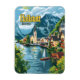 Ein malerisches und nostalgisches Porträt von Hallstatt, Österreich, bekannt für seine atemberaubende alpine Landschaft, seinen historischen Charme und die malerische Umgebung am See. Das Design spiegelt sich in den idyllischen, pastellfarbenen Häusern des Dorfes wider, die sich in den ruhigen Gewässern des Hallstätter Sees, umgeben von hohen Bergen, widerspiegeln. Das Vintage Kunstwerk erinnert an die ruhige Schönheit und den zeitlosen Reiz von Hallstatt und lädt die Besucher ein, die idyllische Landschaft und das reiche Kulturerbe zu erleben.