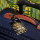 Das Gepäckanhänger "Paws off my bag" mit einem farbigen Foto der Vorderansicht eines ruhenden Leoparden mit gekreuzten Vorderpfoten, leicht verbeugtem Kopf und teilweise geschlossenen Augen. Foto Guthaben an Karen Grigoryan, www.grigphoto.com. Genehmigte Lizenz erworben und vorhanden. E-Mail niteowlstudio@gmail.com , wenn Sie Hilfe benötigen.