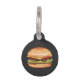 Desteis Beispiel eines Hamburgersnacks mit Sesam-Samenknochen, gefüllt mit Käse, Salat, Rind, Tomaten, Ketschup und Beizen. Die Hintergrundfarbe ist dunkelgrau, fast schwarz. Auf der anderen Seite gibt es zwei personalisierbare Textbereiche, in denen einer für den Namen des Tieres ideal ist, während der andere für die Telefonnummer des Besitzers verwendet werden könnte.