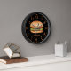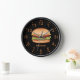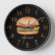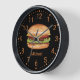 Desteis Muster von illustrierten Hamburgern, die Sesam-Samengebäck gefüllt mit Käse, Salat, Rind, Tomate, Ketschup und Beizen. Die Uhr besteht aus orangefarbenen Zahlen und die Minuten und Stunden werden mit Kreisen angezeigt. Die Hintergrundfarbe ist schwarz, kann aber auf Wunsch in jede andere Farbe geändert werden. Es gibt auch einen personalisierbaren Textbereich für einen Namen oder einen anderen benutzerdefinierten Text.