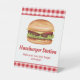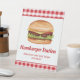 Entworfen für Party, die einen DIY-Hamburger-Bar haben, der es den Gästen ermöglicht, ihren eigenen Burger mit den Füllungen und Decks zu bauen, die sie genießen. Das Design zeigt Desteis Darstellung eines Hamburgers, der einen Sesam-Samenbrunnen hat, der mit Käse, Salat, Rindfleisch, Tomaten, Ketschup und Beizen gefüllt ist. Die Haupthintergrundfarbe ist weiß, während Oben und Unterseite ein rotes Gingham-Muster aufweisen. Es gibt auch zwei personalisierbare Textbereiche im roten Schriftart.