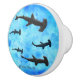 Der schöne Ausblick von unten als Haifischschule schwimmt anmutig entlang des offenen Meeres, das von einer Sonne überragt wird. Ein lebendiges Kunstwerk für jeden, der Hai-, Tier- und Ozeanliebhaber ist, in stilvollen Knöpfen und Pullen für Ihre Zuhause-Möbel, Schrank und Schublade Dekoration. Genießen Sie die künstlerischen Freuden der nautischen Natur, der Tierwelt, des Ozeans und der blauen Unterwasserwelt mit der Schule der Hammerhead Haie in der Silhouette Keramik Knobs.