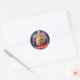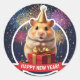 Süßer goldener Hamster sitzt auf einer kleinen Geschenkschachtel mit einer Partyhut, umgeben von funkelndem Konfetti. Helles, fotorealistisches und festliches Frohes Neues Jahr Aufkleber