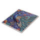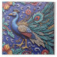 A highly detailed relief carving of a peacock, the peacock is blue with gold legs and a white and gold back, the background is a deep blue with swirling patterns and flowers, the carving is very intricate and detailed, with a lot of small details, the style is reminiscent of folk art.