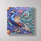 A highly detailed relief carving of a peacock, the peacock is blue with gold legs and a white and gold back, the background is a deep blue with swirling patterns and flowers, the carving is very intricate and detailed, with a lot of small details, the style is reminiscent of folk art.