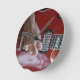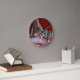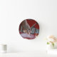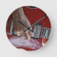 Hand, die rote elektrische Gitarre nahe Runde Wanduhr