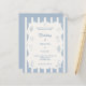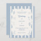 A hand drawn style wedding invitation with beach, coastal theme. A soft ivory and dusty blue striped colored background, with an ivory frame and dusty coastal blue elements. Personalize and add your names and the details.