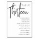Einfache und schicke Tischnummer-Karten in Schwarz und Weiß machen bei Ihrer Hochzeit oder Veranstaltung ein elegantes Statement. Das Design enthält "Table [number]" in einem spannenden Mix aus klassischer Serif und handgeschriebenem Skriptsatz, darunter einzelne Gastnamen. Design wiederholt sich auf beiden Seiten. Einzelne nummerierte Karten werden separat verkauft; bestellen Sie jede Tischnummer einzeln aus unserer Sammlung.