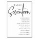 Einfache und schicke Tischnummer-Karten in Schwarz und Weiß machen bei Ihrer Hochzeit oder Veranstaltung ein elegantes Statement. Das Design enthält "Table [number]" in einem spannenden Mix aus klassischer Serif und handgeschriebenem Skriptsatz, darunter einzelne Gastnamen. Design wiederholt sich auf beiden Seiten. Einzelne nummerierte Karten werden separat verkauft; bestellen Sie jede Tischnummer einzeln aus unserer Sammlung.