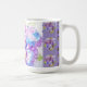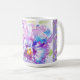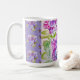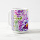 Handbemalte lila Iris Irissen floraler Latte-Mug. Ein herrliches Wasserfarben-Blumendesign. Entworfen nach meinen originalen Wasserfarben-Gemälden, die ich in meinem eigenen Blumengarten gemalt habe.