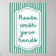 Fügen Sie Ihrem Bad eine Touch Eleganz hinzu, mit diesem aquamarinen, grün bedruckten Schild mit einem Bitte waschen Sie Ihre Hände Zitat. Dieses Poster ist ideal, um eine stilvolle Erinnerung hinzuzufügen, um die Hände sauber behalten.