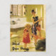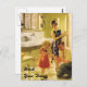 1920 Illustration eines kleinen Gurls, der ihre Hände in ihrer hübschen Küche mit ihrer Mutter und ihrem Vater gewaschen hat. Vater ist auf den Knien und lächelt, während sie ihre Hände auf Sauberkeit hin untersucht. Schöne Vintage Lage