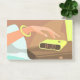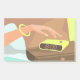 Händeschalten auf den Knopf Wecker-Schlummertaste Post-it Klebezettel