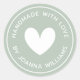 Runde Aufkleber mit weißem Herzen, umgeben von dem Text "handgefertigt mit Liebe" und Ihrem Namen oder anderen benutzerdefinierten Text auf einem hellstaubigen, grünen Hintergrund. Verwendung als Aufkleber für Geschenke und Gefälligkeiten, Produktverpackung usw.